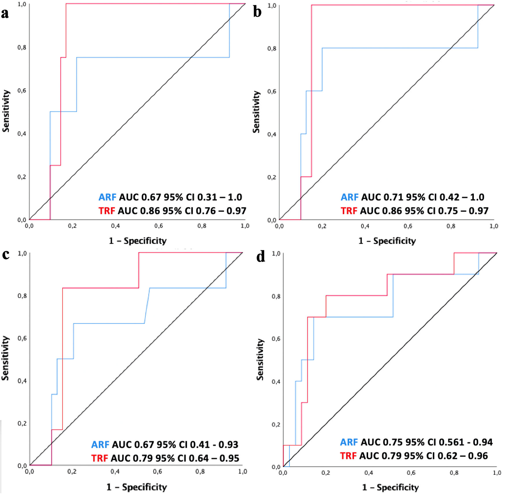 The capability of TRF to predict the development of surgery indications was higher (AUC 0.79, P = 0.006) compared to ARF (AUC 0.75 P = 0.018), but the difference between the two parameters did not reach the statistical signification (P = 0.67), probably due to the limited number of patients. TRF had a similar sensitivity (70%) but higher specificity (89% vs. 85%) compared to ARF. In our study, the mean MRF was 16.4%, which corresponds to mild-to-moderate MR. This might explain the slight difference between TRF and ARF. It is likely that in patients with more severe MR, TRF could have even better prognostic capability than ARF alone.