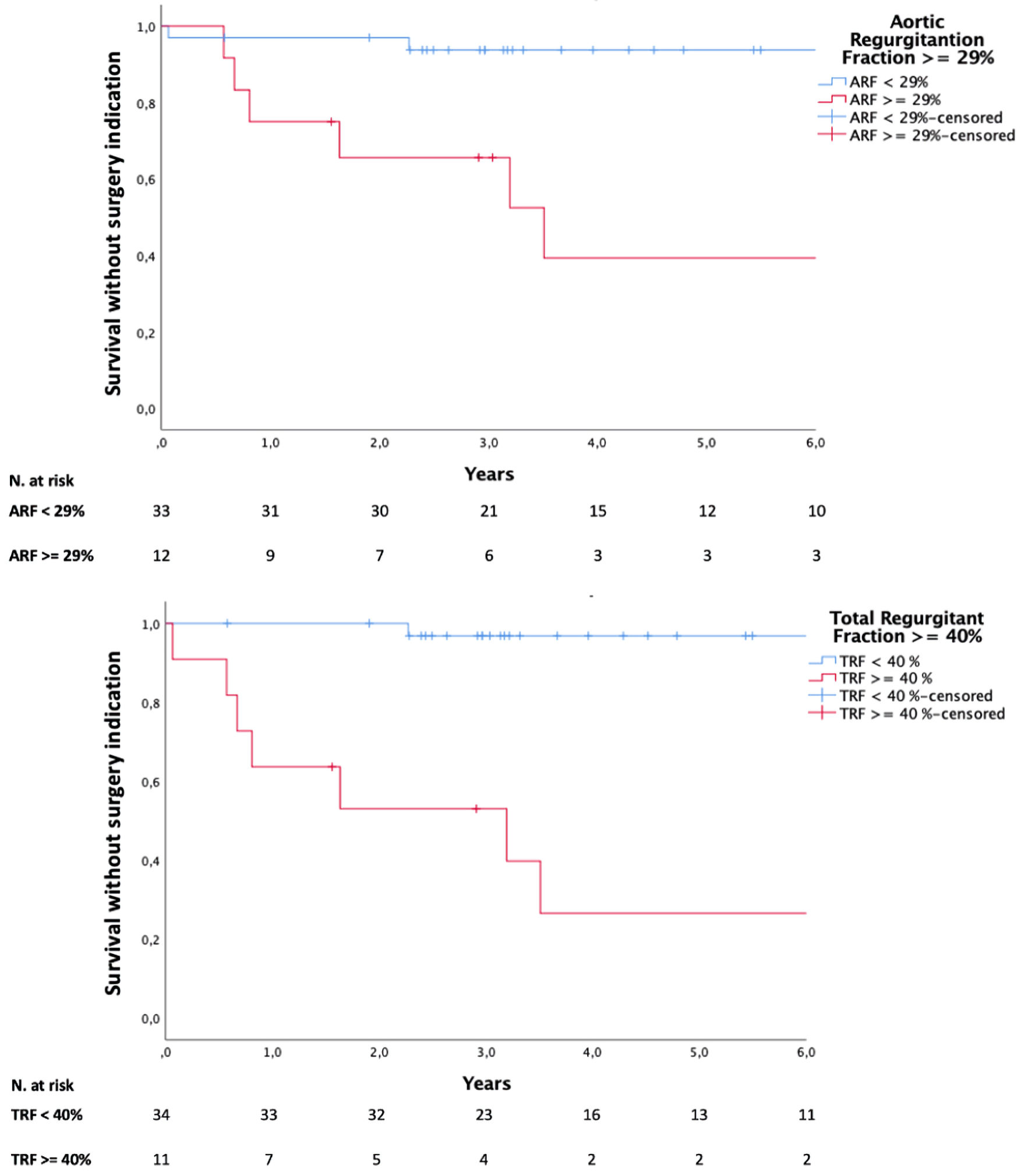 KM curves were built stratified by ARF and TRF cut-offs and are represented in Figure 3. There was a progressive and significant separation of the groups over time (ARF ≥ 29% log rank P = 0.001, TRF ≥ 40% log rank P = 0.000). At the median follow-up time point (3.2 years), survival without surgery indication was 95% in the group with TRF < 40% compared to 90% in the group with ARF < 29%. In contrast, 67% of patients with TRF ≥ 40% developed surgery indications after 3.2 years compared to 55% of patients with ARF ≥ 29%.