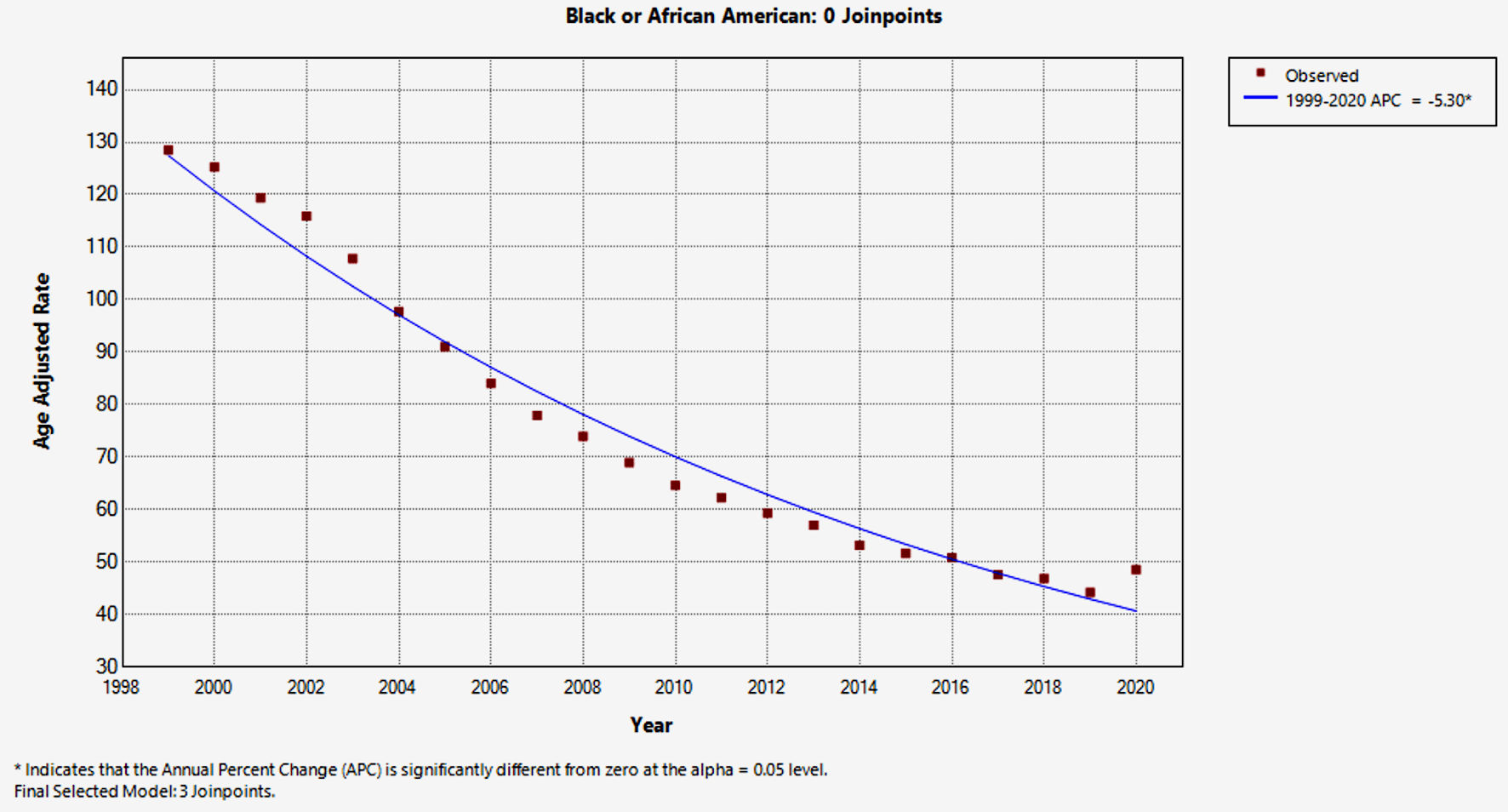 Overall, AAMR decreased in the African American population from 128.5 deaths/100,000 in 1999 to 48.5 deaths/100,000 in 2020, with an average annual percent change (AAPC) of -5.29 (95 % CI: -5.69 to -4.9), as seen in Figure 2.