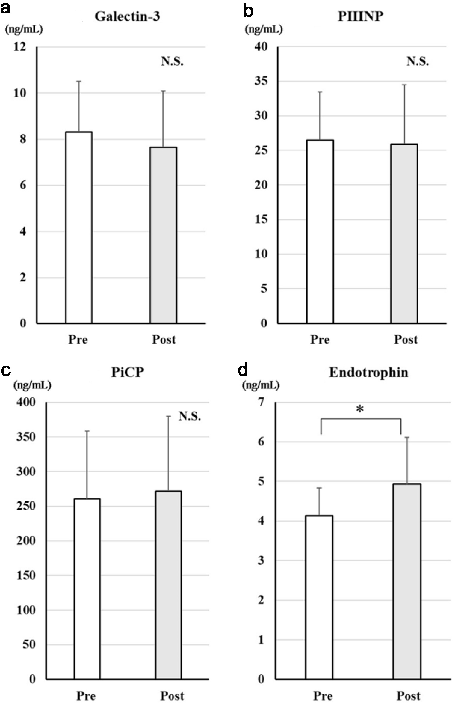 Figure 1 shows the changes in serum markers of fibrosis between before and after dapagliflozin. There were no significant decreases in galectin-3, procollagen I C-terminal propeptide, or procollagen III N-terminal propeptide after treatment. Endotrophin levels significantly increased. On the other hand, endotrophin levels significantly increased.