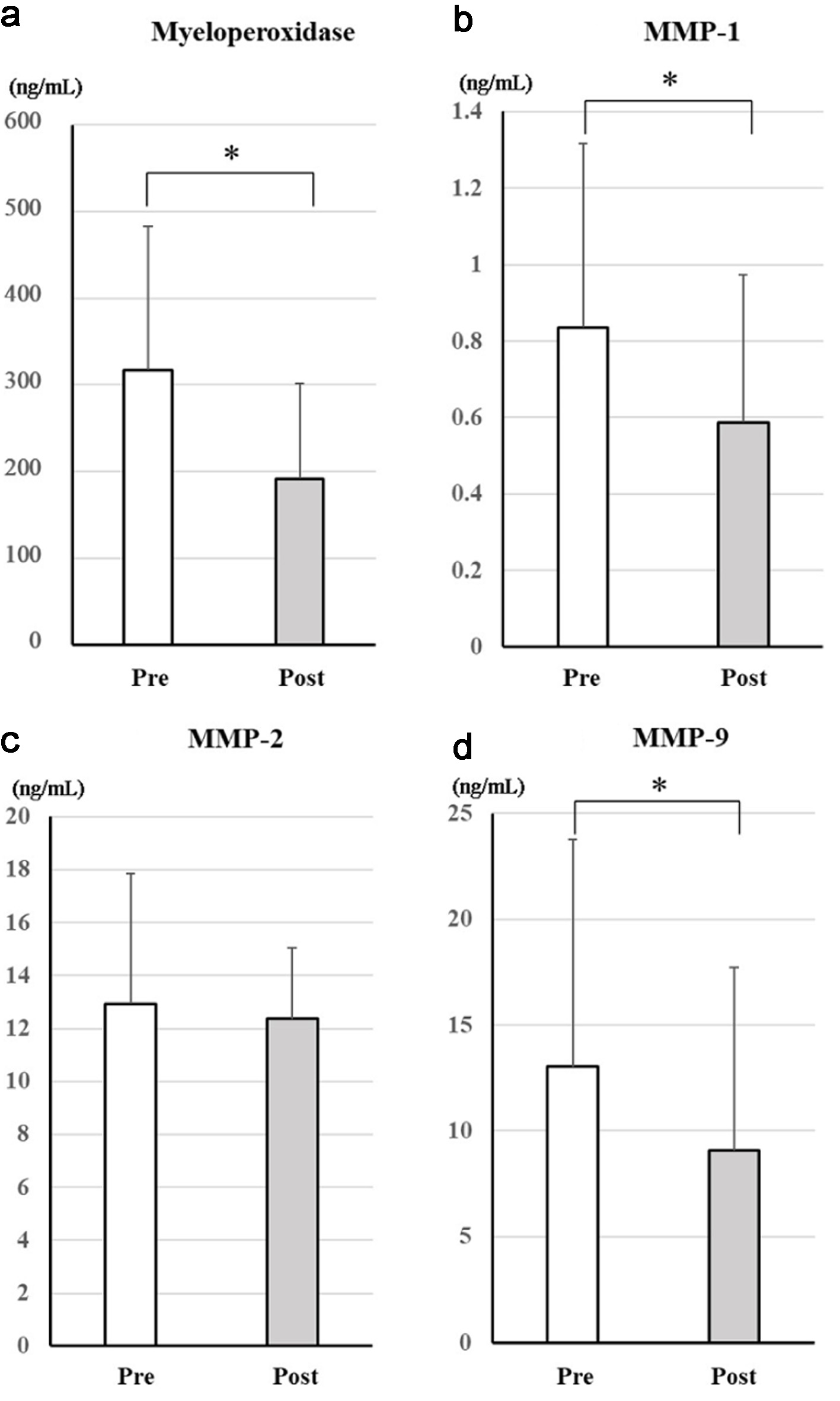 ![]() Click for large image | Figure 2. Changes in serum markers of antioxidative effects after treatment with dapagliflozin for 6 months. Changes in myeloperoxidase (a), MMP-1 (b), MMP-2 (c), and MMP-9 (d) between before and after treatment with dapagliflozin. *Significant differences between before and after treatment. MMP-1: matrix metalloproteinase-1; MMP-2: matrix metalloproteinase-2; MMP-9: matrix metalloproteinase-9; NS: not significant. |