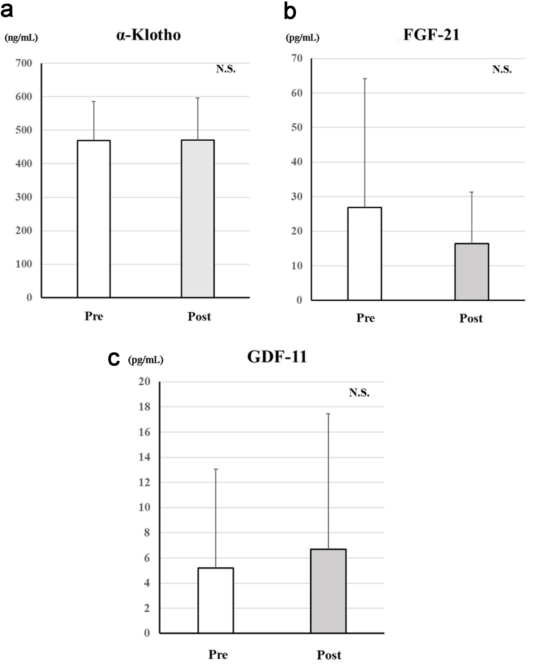 Figure 3 shows the changes in age-related proteins between before and after treatment with dapagliflozin. There were no significant changes in these markers.