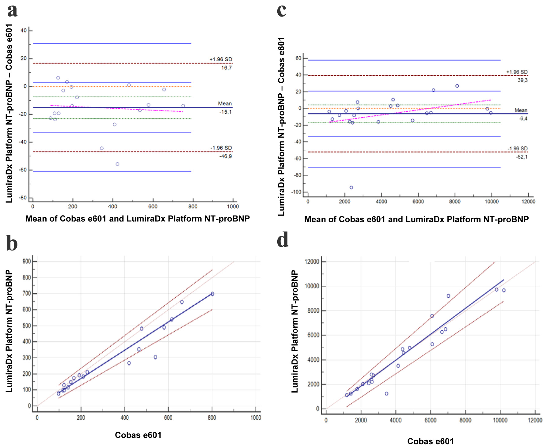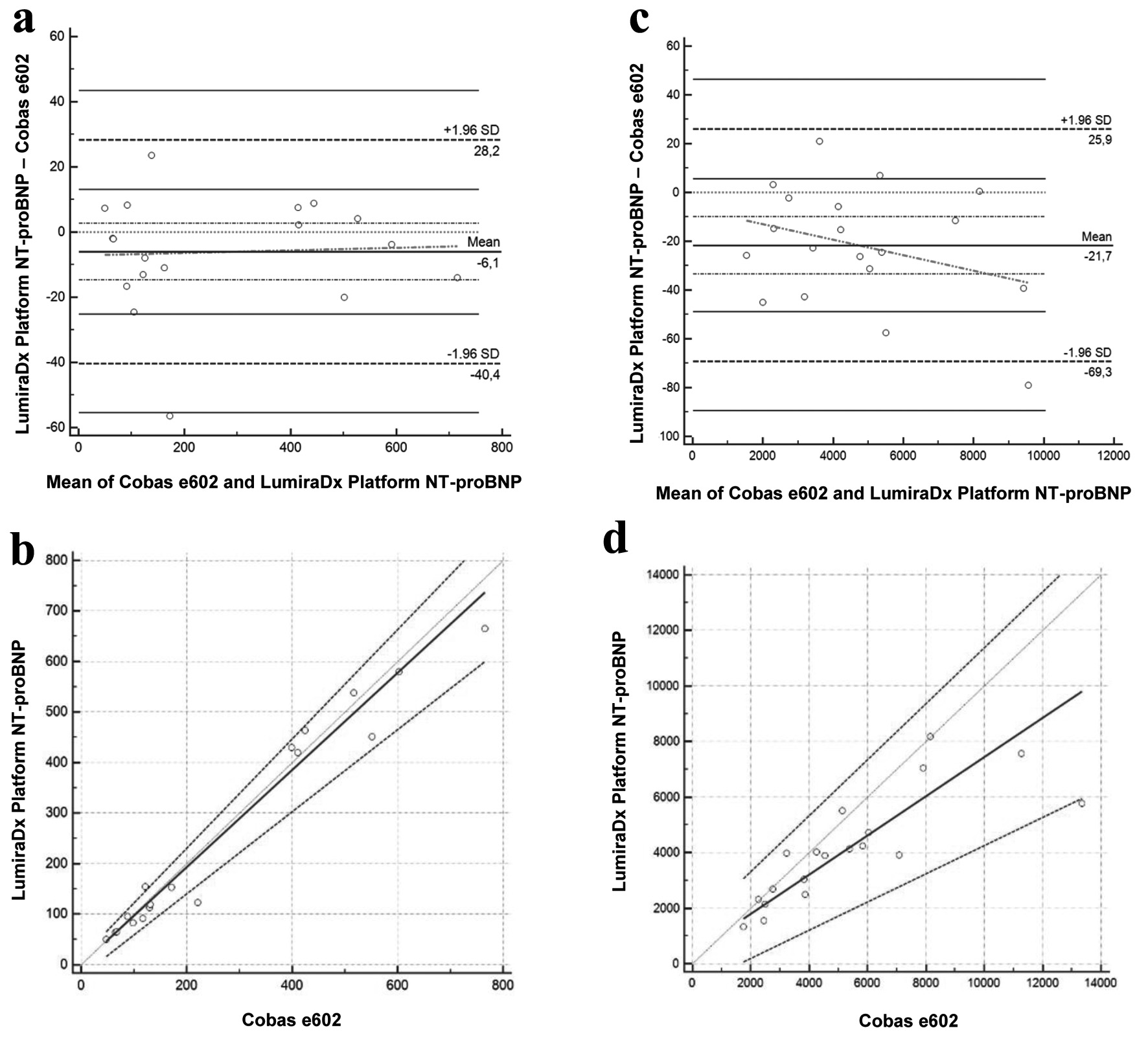 ![]() Click for large image | Figure 2. Bland-Altman and Passing-Bablok for the LumiraDx Platform NT-proBNP assay with the second reagent lot. Bland-Altman (a) and Passing-Bablok (b) of values < 1,000 ng/L, for the NT-proBNP LumiraDx Platform assay compared with the gold standard Cobas e601 assay (n = 18). Bland-Altman (c) and Passing-Bablok (d) of values > 1,000 ng/L, for the NT-proBNP LumiraDx Platform assay compared with the gold standard Cobas e601 assay (n = 21). *The units are ng/L and % for Passing-Bablok and Bland-Altman, respectively. NT-proBNP: N-terminal pro-brain natriuretic peptide. |