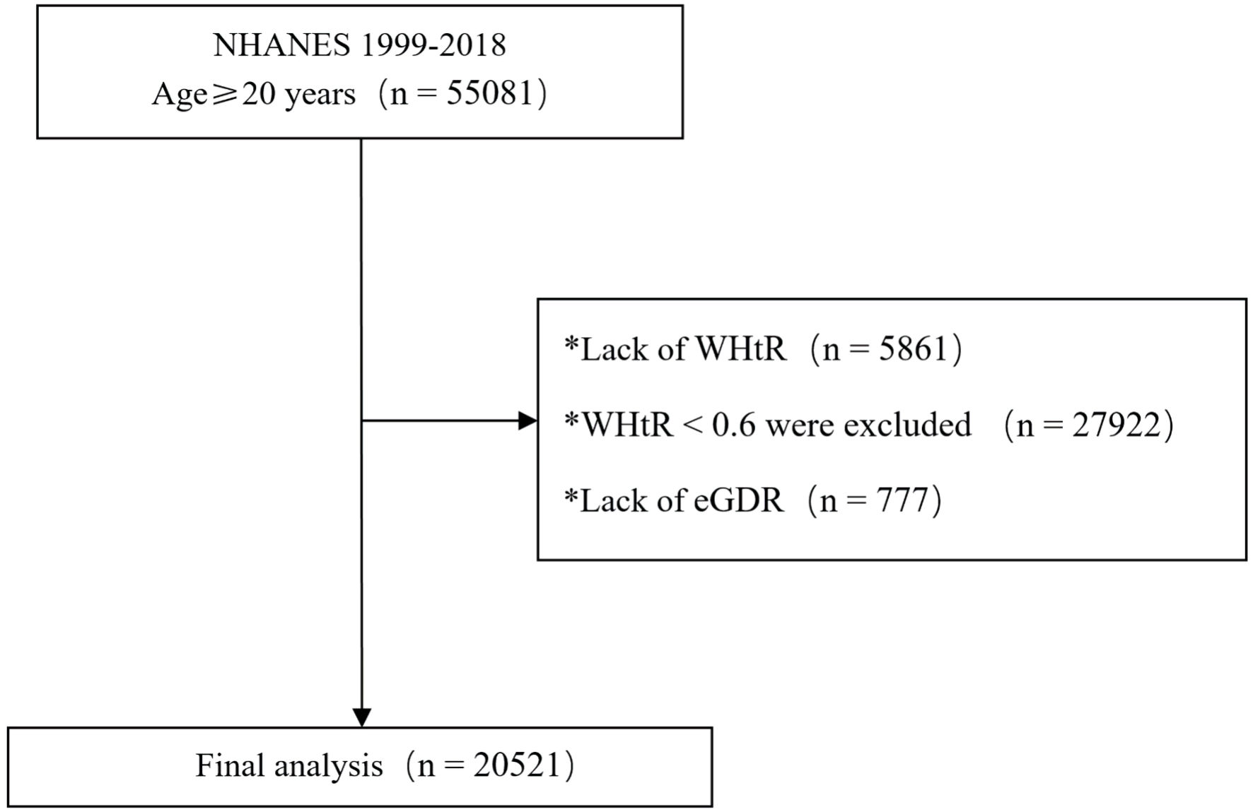 The Centers for Disease Control and Prevention (CDC)’s NHANES offers crucial health statistics for shaping public health policy and research. The survey protocol was approved by the Research Ethics Review Board at the National Center for Health Statistics (NCHS). Public access to the datasets employed and reviewed in this study is available on the NHANES website. The data utilized were deidentified; therefore, the study did not need the Institutional Review Board (IRB) approval. An ethics statement was not applicable for this study. Data from NHANES between 1999 and 2018 were used for analysis, excluding participants younger than 20, those missing WHtR or eGDR data, and those with incomplete CVD diagnosis information.