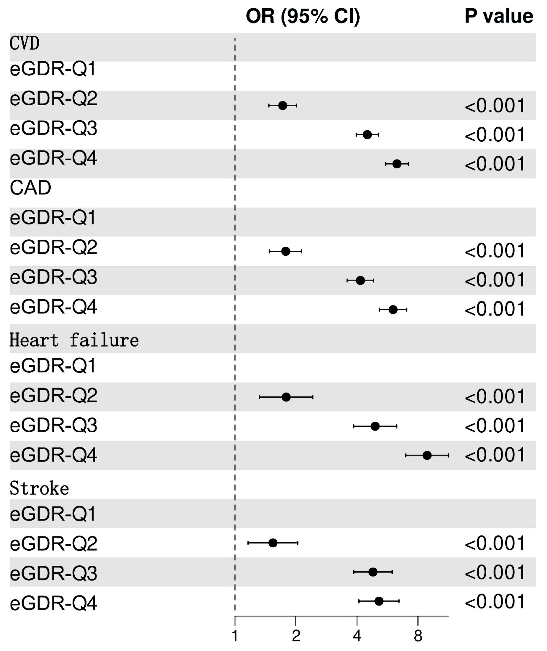 Logistic regression analyses, both univariate and multivariate, were performed to assess the association between covariates and CVD, with CVD serving as the dependent variable (Table 2). Multivariate analysis identified the lowest eGDR quartile (eGDR ≤ 4) as an independent risk factor for CVD (P < 0.001), using the highest quartile (eGDR > 8) as the reference. All models consistently indicated a significant positive association between lower eGDR levels (Q4) and increased CVD risk (P < 0.001) (Table 3).