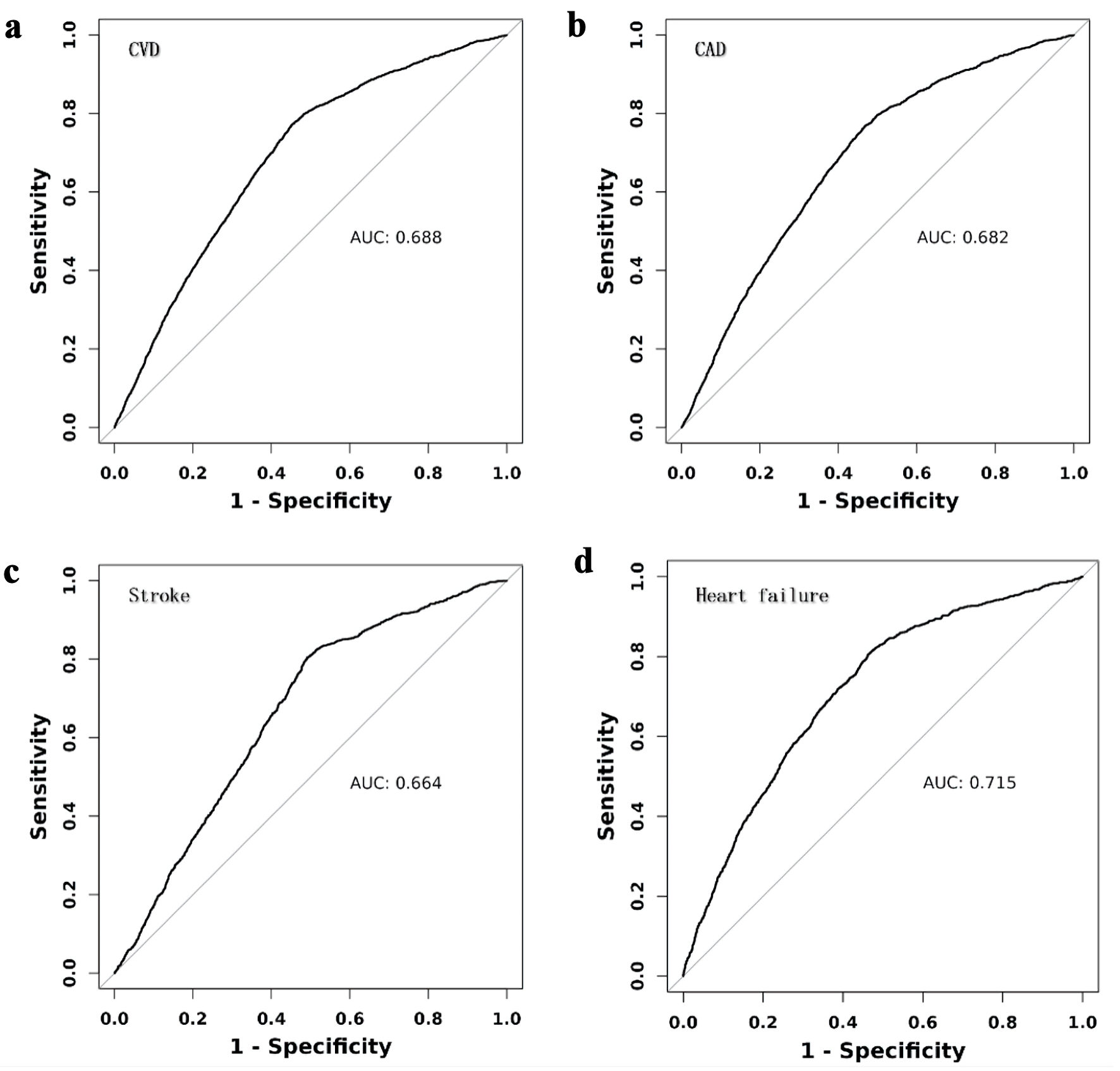 ![]() Click for large image | Figure 3. Receiver operating characteristic (ROC) curves for eGDR in predicting cardiovascular diseases (CVD). CAD: coronary artery disease; AUC: area under the receiver operating characteristic curve. |