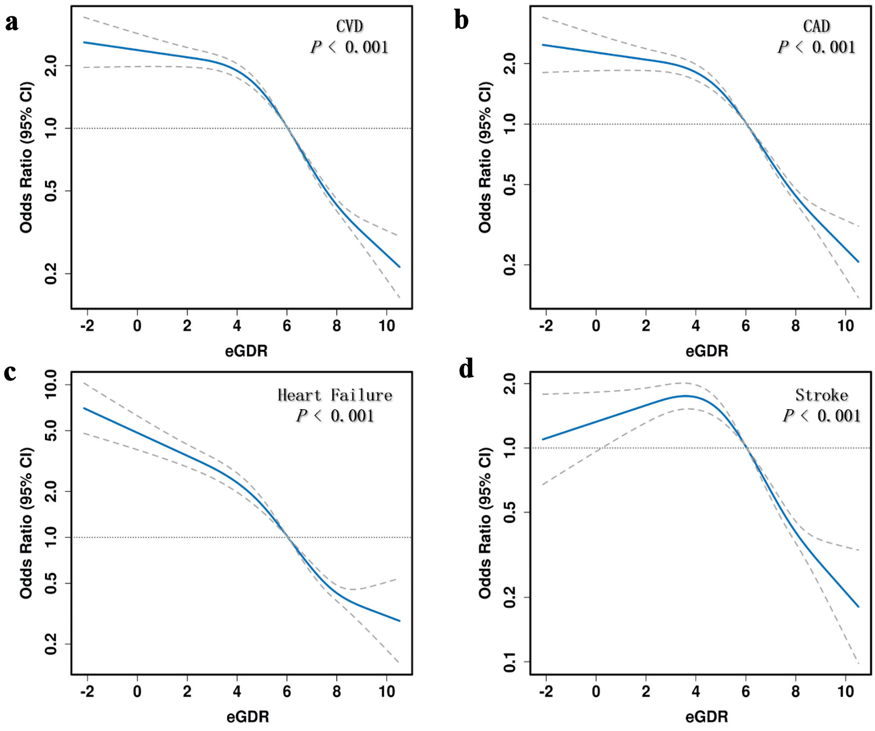 Results: CVD prevalence significantly increased with decreasing eGDR levels (Q1: 5.3% vs. Q4: 26.2%). After full adjustment for covariates, multivariable regression confirmed that the lowest eGDR quartile (Q4) was strongly and independently associated with a substantially elevated risk of CVD compared to the highest quartile (adjusted odds ratio (OR) = 6.3; 95% confidence interval (CI): 5.53 - 7.17; P < 0.001). eGDR also demonstrated good predictive performance for specific CVD subtypes, with the highest AUC for heart failure (0.715, 95% CI: 0.699 - 0.730). RCS analysis validated a significant non-linear, inverse dose-response relationship between eGDR and overall CVD risk. Subgroup analyses, stratified by age, sex, and glycemic status, consistently demonstrated a significant association between low eGDR and increased CVD risk across all categories (P < 0.001).