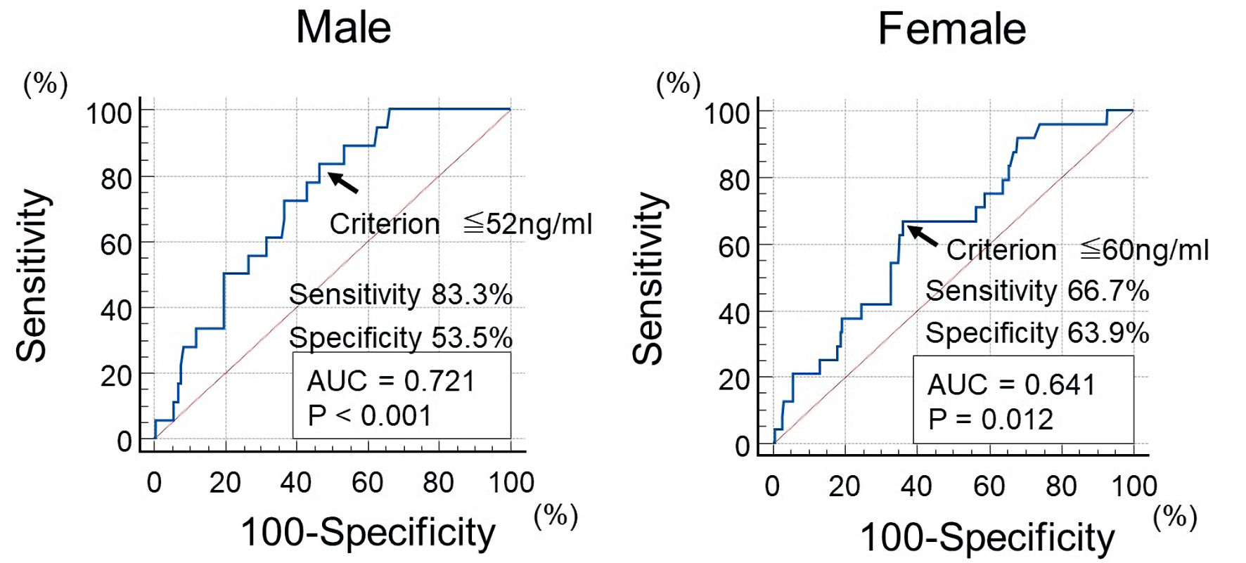 ![]() Click for large image | Figure 1. The optimal cut-off value of pre-LpL mass for initial CAD event using ROC curve analysis. Using ROC curve analysis, participants were divided into two groups (low pre-LpL mass (group L) or high pre-LpL mass (group H)) by pre-LpL mass (cut-off value: 52 ng/mL for men, 60 ng/mL for women). The arrows indicate the optimal cut-off point value. CAD: coronary artery disease, pre-LpL mass: preheparin serum lipoprotein lipase mass; ROC: receiver operating characteristic; AUC: area under the curve. |