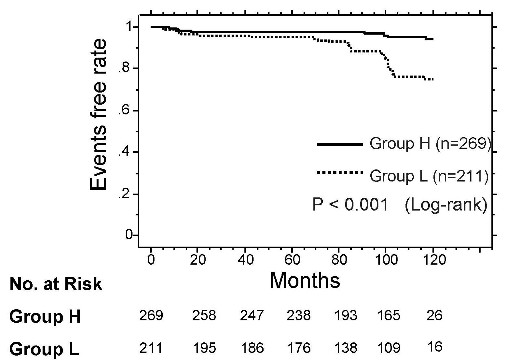 The Kaplan–Meier curve analysis for the incidence of a primary CAD event is shown in Figure 2. The median observation period was 107 months (range: 2–120 months). During the observation period, a primary CAD event occurred in 42 patients (group L: n = 31 (14.7%) vs. group H: n = 11 (4.1%)). Group L had a significantly higher incidence of a primary CAD event than group H (P < 0.001, log-rank test).